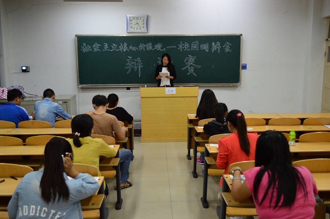 为了提高老员工的思维反应速度和沟通技巧,深入开展“社会主义核心价值观主题宣传月”活动,经济管理系于9月24日18点30分在7号教学楼308室举行了以“社会主义核心价值观”为主题的校园明辩会。参加“海峡两岸辩论赛 ”选手我系13级本科员工张琳菲以及张东升、刘浩担任此次比赛的评委,13级专科员工滕赛男主持了此辩论赛,13级员工共8名选手、70余名同学参加了本次辩论赛。