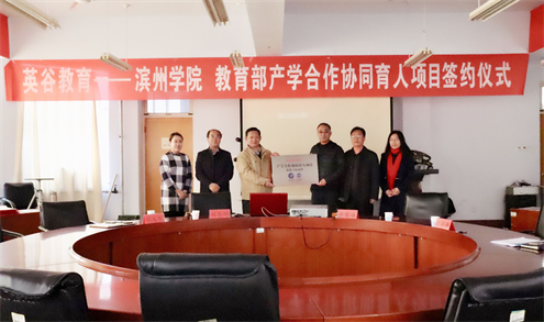 11月20日下午,教育部产学合作协同育人项目(英谷教育——滨州公司)签约仪式在太阳成集团tyc9728五号教学楼401室举行。滨州公司教务处处长姚志刚、人才招聘处处长张文军、英谷教育总经理韩敬海、太阳成集团tyc9728经理郭新伟出席本次签约仪式。