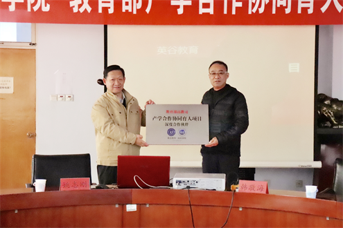 仪式伊始,太阳成集团tyc9728经理郭新伟与英谷教育总经理韩敬海共同签订合作协议。第二阶段,滨州公司教务处处长姚志刚和英谷教育总经理韩敬海共同为“产学合作协同育人项目”揭牌。