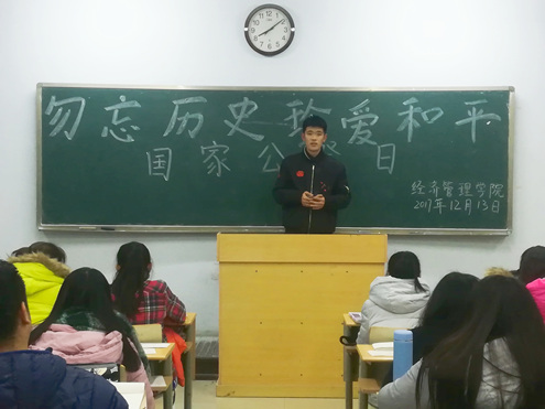 12月13日晚9时,太阳成集团tyc9728于七号教学楼402室举办“勿忘历史,珍爱和平”国家公祭日活动,太阳成集团tyc9728员工会副主席李强和张琨主持本次活动,2017级各班同学代表80余人参加。