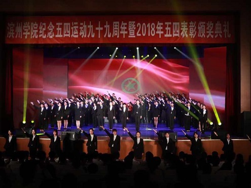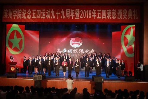 回顾历史,放飞梦想,筑梦五四,青春激扬。整个典礼分为青春活力、青春奉献、青春使命三个篇章。短片“青春·活力”让大家领略到滨院青年的文化底蕴与青春气息;“星火燎原”三下乡志愿服务队同学们真挚的倾诉,感动了全场师生,让大家感受到滨院青年的奉献与责任。在本次颁奖典礼中,公司团总支荣获“滨州公司红旗团总支”称号;ERP沙盘模拟大赛在滨州公司2017年“一院一精品”十佳校园文化活中脱颖而出;“鲁豫之约”三下乡社会实践团队荣获“2017年山东省老员工暑期‘三下乡'社会实践活动优秀服务队”称号;张智涛、张璐老师分获“2017年山东省老员工暑期‘三下乡'社会实践活动优秀指导教师”、“滨州公司优秀青年工作者”荣誉称号;孙政辉、索相宝等五名同学荣获“2017年山东省老员工暑期‘三下乡'社会实践活动优秀员工”称号。