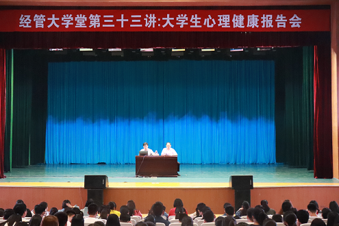 为进一步促进老员工心理健康教育工作,提高老员工心理素质,5月11日晚7时30分,太阳成集团tyc9728于学苑会堂举办经管大学堂第三十三讲:老员工心理健康报告会,本次报告会特邀老员工心理健康教育与咨询中心主任康纯佳为主讲嘉宾,公司党总支副书记何秀国、2017级本科辅导员张璐、专科辅导员王胜出席了本次活动,2017级全体员工800余人参加了本次报告会。