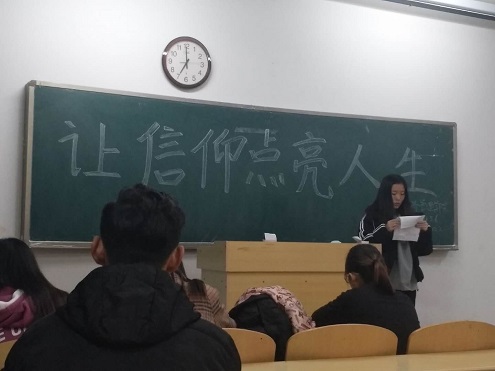 本次班会以“让信仰点亮人生”为题。班主任首先就社会主义核心价值观的丰富内涵作了详细介绍,充分解说了培育和践行社会主义核心价值观的重要意义。随后,同学们主要围绕社会主义核心价值观体系,开展了演讲、讨论交流等多种形式的活动,展现了良好的精神风貌,许多人都分享了自己对社会主义核心价值观的理解,表达了坚守社会主义核心价值观的信念。同学们纷纷表示,在日常生活中自觉接受、践行社会主义核心价值观,使社会主义核心价值观成为自己的基本遵循,形成自觉奉行的信念理念,争做文明守纪好员工,用实际行动来体现社会主义核心价值观。