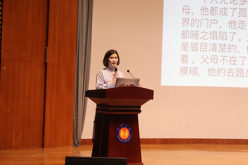 活动伊始,主持人介绍了本次活动的评委老师及比赛规则。此次活动按照抽签顺序进行,各位选手依次讲述自己推荐的书目,其中不乏中外名著《平凡的世界》、《骆驼祥子》、《小王子》等经典读物。公司参赛选手唐丹丹以一首《时间都去哪了》引出了父母与子女间感情的深切及奇妙,歌曲中所唱柴米油盐半辈子,转眼就剩下满脸的皱纹了引起了观众对亲情的感慨共鸣。在悠长动人的音乐伴奏下,唐丹丹缓缓引出她所推荐的书目《目送》,并声情并茂的讲述了龙应台在兼顾事业,照顾子女的同时,又细致入微的孝顺父母的动人故事。舞台上灯光耀眼,观众席全神贯注,她的讲述让大家深深体会到父女母子之间的缘分,是将你和他手上系了一根线,他的渐行渐远不能拉动你,却有了一丝痛楚,是牵挂,是回忆,是生的意义。同学在聆听时陷入沉思,随后掌声四起。最后,唐丹丹以其出色的表现获得了二等奖。