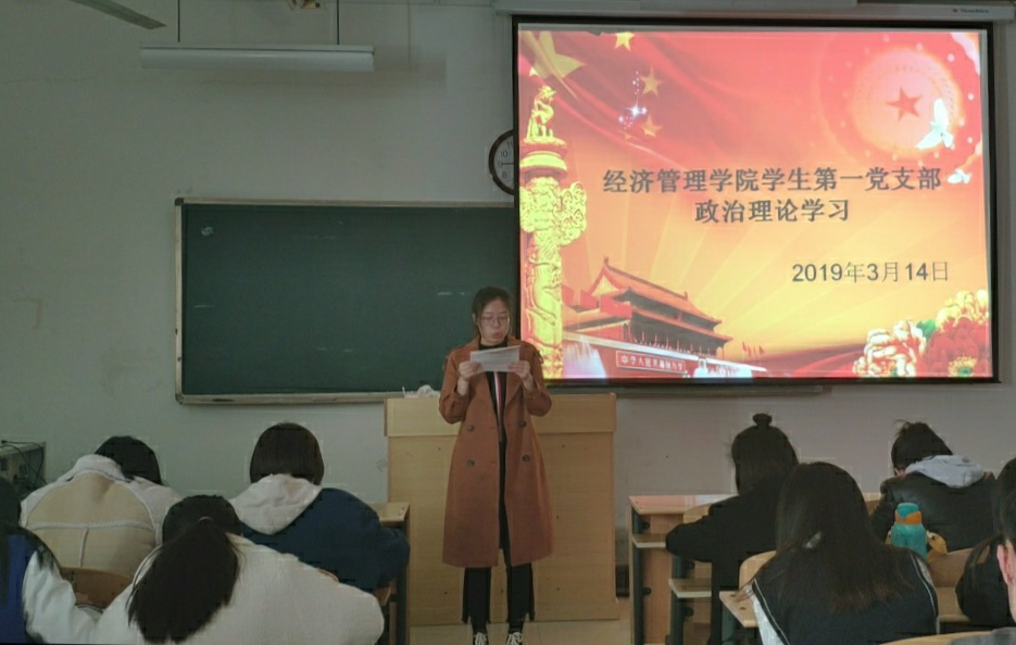 本次学习活动分为三个阶段。首先,由宣传委员王贝贝带领大家学习了《习近平在中央党校中青年干部培训班开班式上发表重要讲话》,通过原原本本、逐字逐句的诵读,使支部成员对讲话精神有了全面的认识和理解。随后,组织委员王胜通过PPT的形式,讲解了两会期间习近平总书记六下团组讲话重点,对文艺社科工作者的“四要”、生态文明建设的“四个一”和“四要”、脱贫攻坚的“五要”等内容进行重点解说。最后,支部书记张璐带领大家共同学习了《2019年政府工作报告》,并对本次学习活动进行总结。她要求同学们利用好“学习强国”平台,加深政治理论知识学习,将学习成果贯彻落实到平日的学习和工作中,不断奋进。