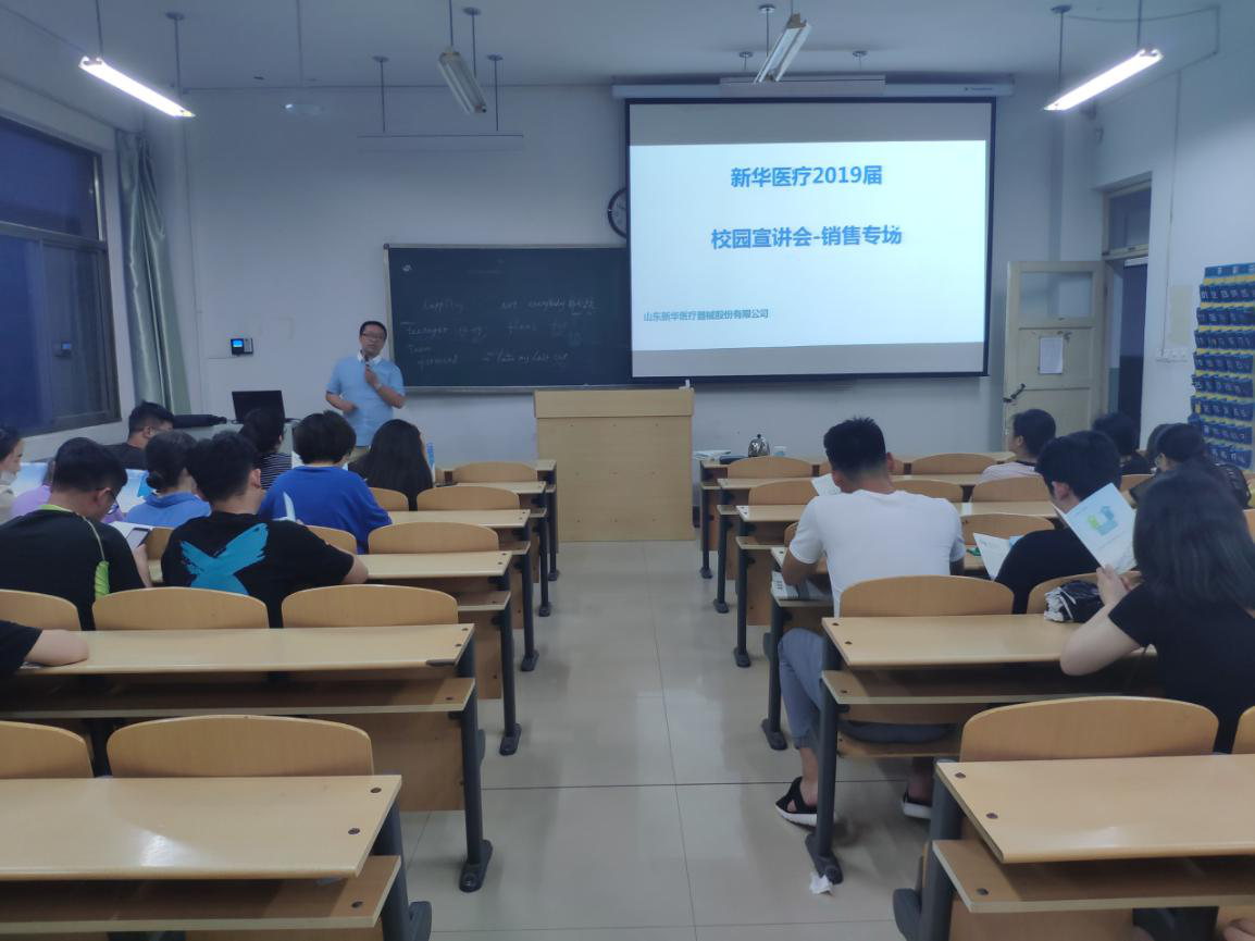 5月26日晚,新华医疗于7教301教室举办新华医疗2019届校园招聘宣讲会。太阳成集团tyc97282019年部分应届毕业生参加了此次宣讲会,新华医疗公司的周经理为此次宣讲会的讲解人。