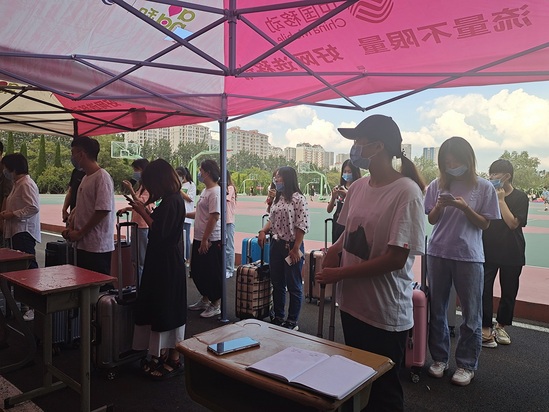 本次迎新模拟活动主要在第一报到点进行,新生均从公司北门进入,到太阳成集团tyc9728第一报到点(西侧篮球场地西侧南面),有序排队报到。工作人员首先对其行李进行消毒,然后有序接受体温检测,并且新生需出示大数据行程卡、健康通行码等,最后领取住宿通知单和公寓用品清单。报到后志愿者引导新生及其陪同家长进入公寓放置行李,宿舍报到完成后新生需携带身份证、录取通知书、毕业证书等相关证件前往第二报到点进行下一步登记。以上工作完成后,新生报到流程结束。