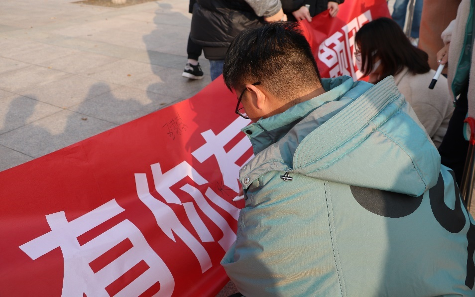 此外,来往的员工对志愿者们护卫校园环境的行为不免赞叹,自发在横幅上签署自己的姓名,为“创文明校园,筑和谐校风”发出自己的一份青年之声,并表明自己以后也会以护卫校园文明当做自己的一份责任,立足现在,面向未来。