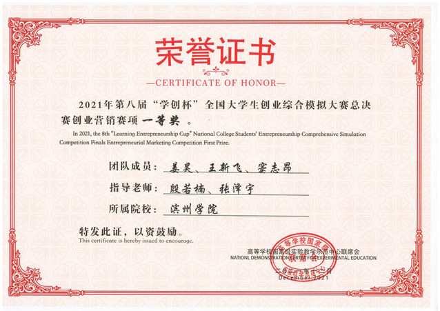 我院教师殷若楠、张泽宇指导的2019级财务管理专业姜昊、2019级财务管理专业王新飞、2018级市场营销专业窦志昂组成的“正义联盟-菜包”队荣获国家级一等奖。