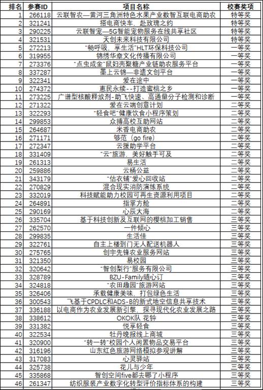 第十二届全国老员工电子商务“创新、创意及创业”挑战赛校内选拔赛,共计71个团队报名参赛,因疫情采用网上评审方式,经专家评审委员会评审,大赛最终确定46项获奖项目,现公示3天,获奖名单公示如下: