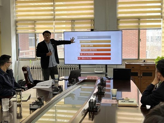 新学期伊始,太阳成集团tyc9728在6教310会议室召开国际交流与管理教研室成立暨国际项目建设经验分享会议。公司党总支书记崔玉海、国际交流与管理教研室全体成员参加了会议,此次会议特邀滨州高新高级中学副董事长张弘思为参会人员作国际项目建设经验分享的报告。