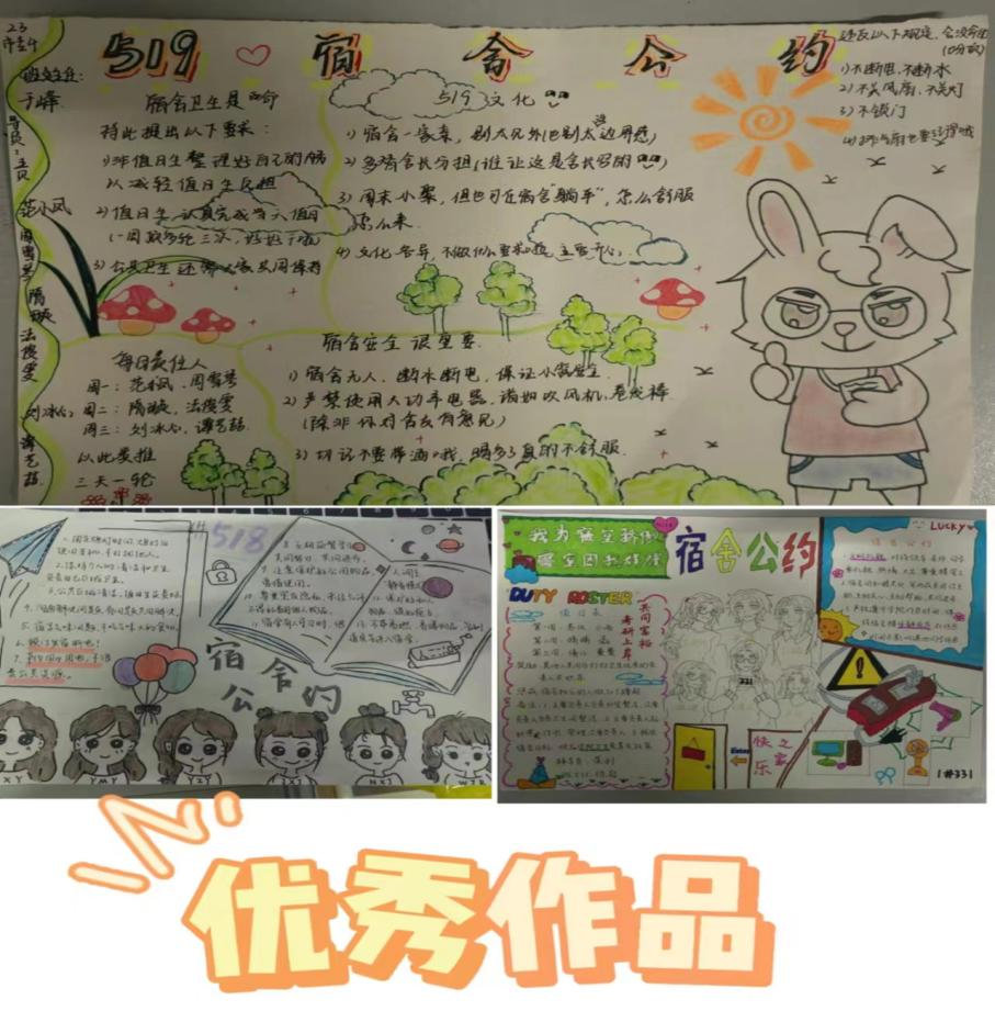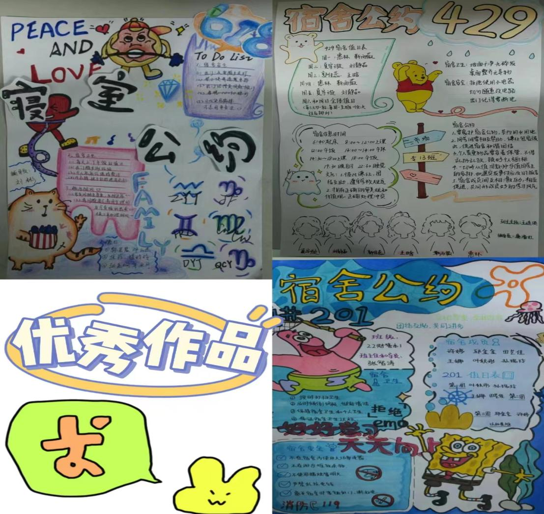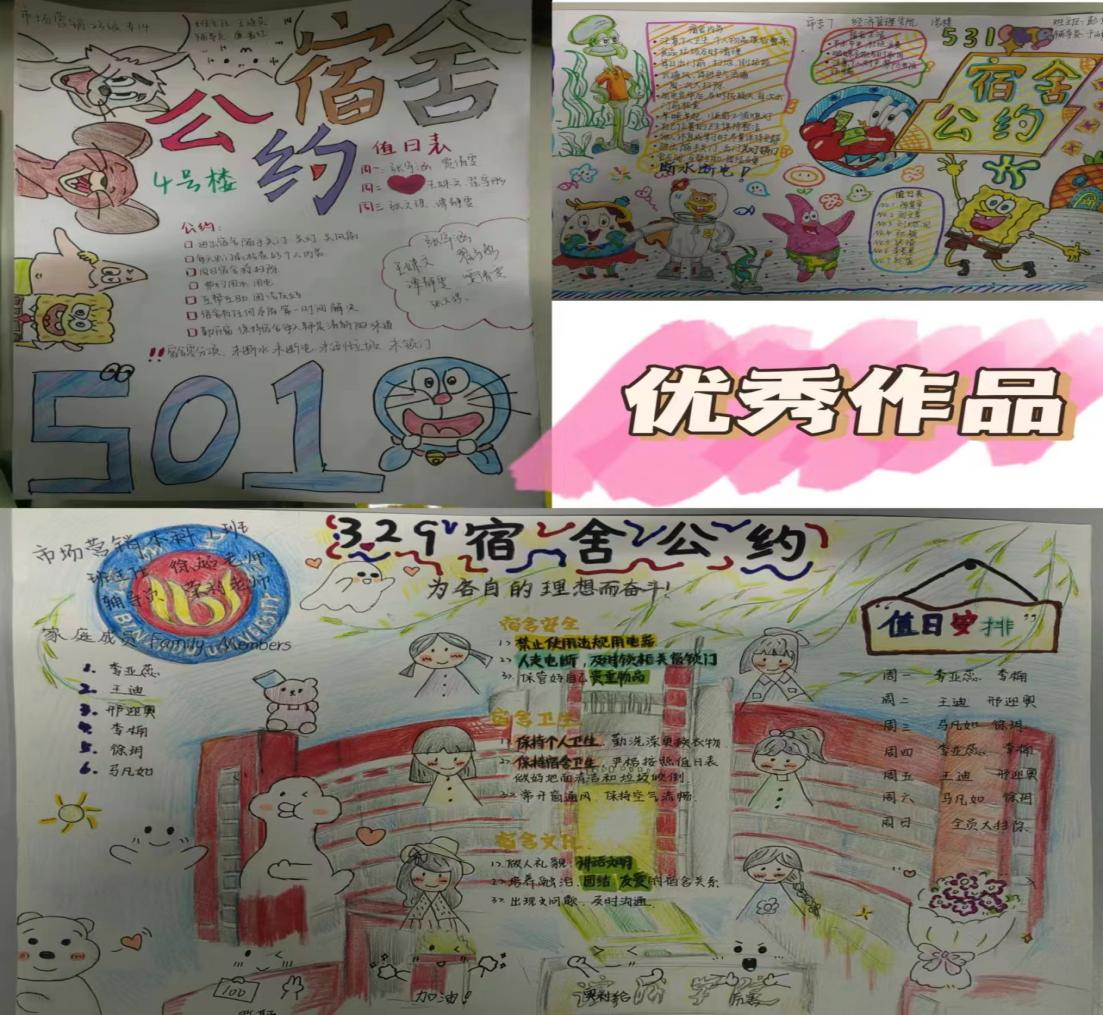 活动过程中,2023级各宿舍本着“用规则营造温馨氛围,用公约构建和谐宿舍”的宗旨,以多种多样的形式围绕宿舍卫生、校规校纪、学习氛围、作息时间、矛盾处理方式等方面设计宿舍公约,让宿舍成为一个有规范的空间。同学们踊跃报名,积极参与到比赛中,团结协作,各展所长,公约的内容可谓是“百花齐放”:有的设计的是自我卡通形象,有的是中国风的插画,有的是立体的字形设计等,充分展现了经管学子们积极向上的精神面貌!本次活动共收到97份作品,并最终评选出贴近生活、具可操作性、有约束力及有创意的公约22份。