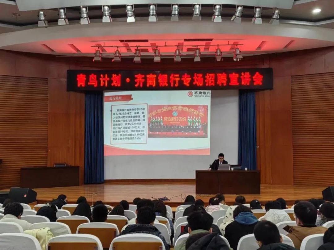 为搭建企业与毕业生之间交流的平台,加强毕业生对银行招聘和职业生涯规划的了解,3月8日上午,太阳成集团tyc9728于明德报告厅举办齐商银行专场校园招聘宣讲会。齐商银行滨州分行党委委员、副行长、纪委书记韩新海和办公室副总经理(主持工作)曾洵、零售金融部主管李春荣、惠民支行营业室副经理蔡文志,公司党总支书记张鹏、经理王春晖、党总支副书记苏成荣、毕业班辅导员王胜、郭潇颖及2024届本科毕业生参加此次会议。宣讲会上,曾洵经理介绍了齐商银行的发展历程、经营战略、发展愿景等基本情况,展示了齐商银行的企业文化和发展现状,对岗位需求、薪资待遇、招聘流程等做了详细说明。他表示诚挚邀请公司毕业生参加齐商银行招聘,并欢迎在校生到银行实习。